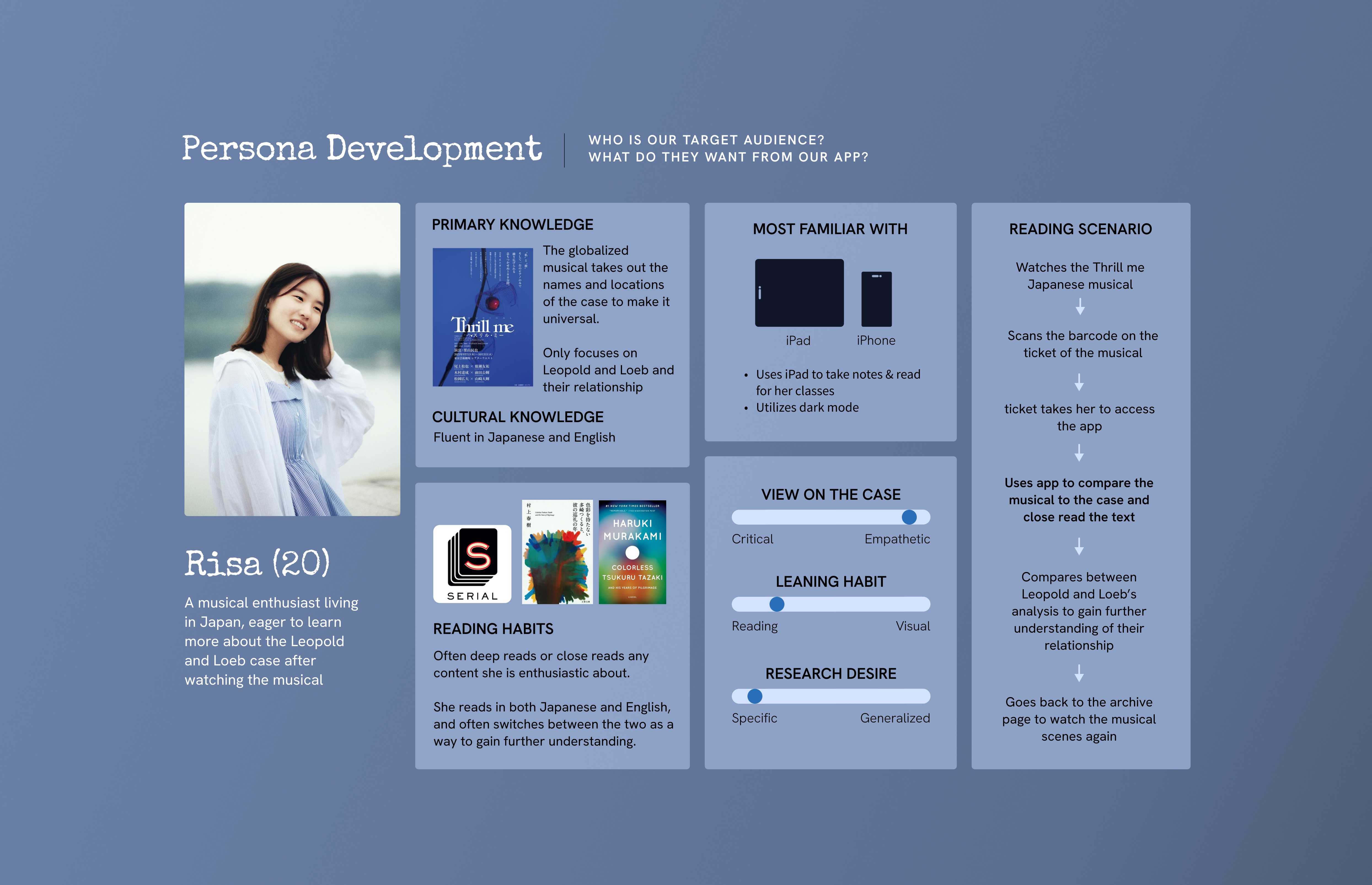 We found contents online that covered the trial and the true crime, but one notable content that came to our eye was a musical called “Thrill Me” inspired by the case. We found out that there was a large group of musical fans from East Asia who came in contact with this case and was eager to learn more about the characters. We identified the niche and looked for issues that they face and changed them into a strategy for building our app. We found two issues: